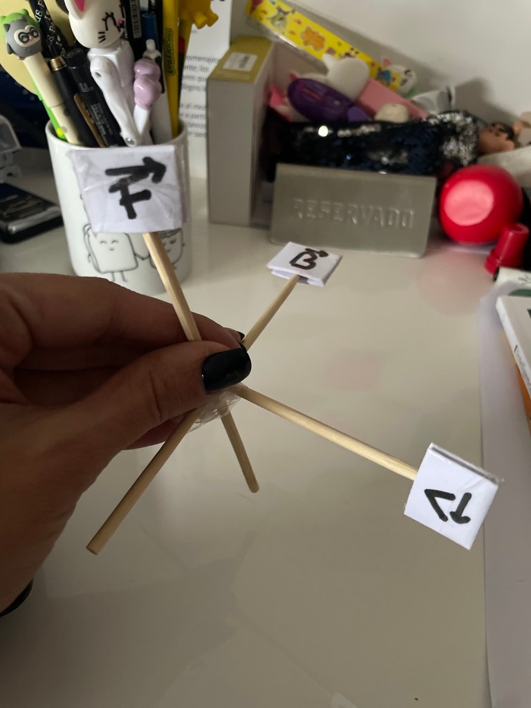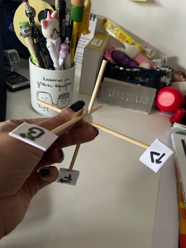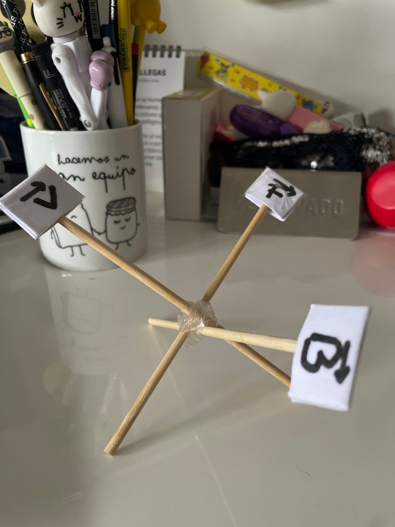 Si quieres practicar en casa la regla de la mano derecha y no esguinzar la muñeca, puedes construir este sencillo artilugio y probar con é hacia dónde va el vector fuerza, el vector campo y el vector velocidad. Este ejemplo está hecho para un prontón, recuerda que para el electrón fue en sentido contrario (la fuerza va para el otro lado porque la carga es negativa)